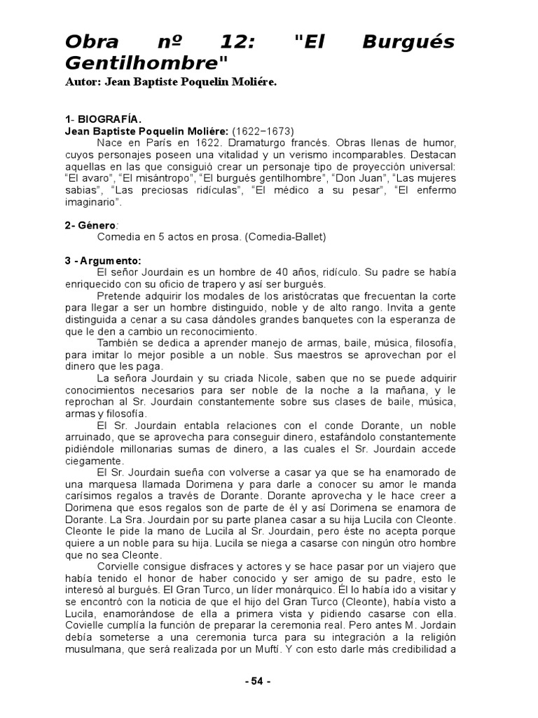 El burgues gentilhombre resumen. El burgus gentilhombre es una comedia en la que se narras las aventuras de un seo de aproximadamente 40 aos llamado Monsieur Jourdain l es un hombre muy rico gracias a una herencia que su padre le dejo Monsieur quiere ser alguien en la vida quiere ser un seor distinguido y quiere tener algn ttulo de nobleza para eso contrata a unos maestro de msica de baile de esgrima y. El burgus gentilhombre describe la ignorancia social de un burgus enloquecido por emparentar con la aristocracia. Teatro de la Barca presenta EL BURGUS GENTILHOMBRE de Moliere el viernes 15 de noviembre a las 21 hs repitiendo el lunes 18 a las 20 hs.
