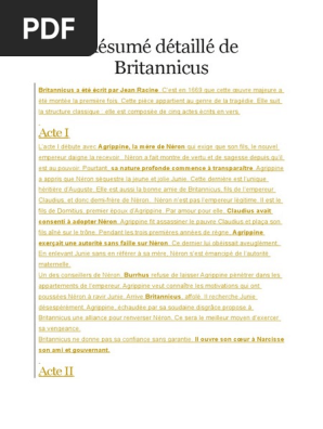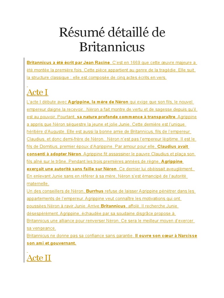 Cette mre ambitieuse et affame de pouvoir a rsolu de marier Junie Britannicus fils de lempereur Claude son. 455 3 avis Description du rsum sur Britannicus Jean Racine Ce document propose un rsum clair et dtaill de Britannicus de Racine dont voici un extrait. Britannicus est la premire tragdie historique romaine de Racine inspire de Tacite.