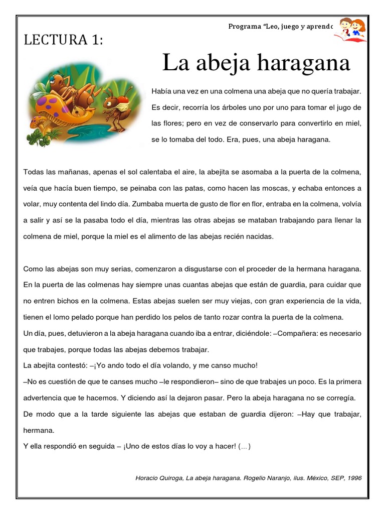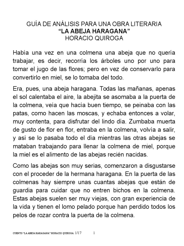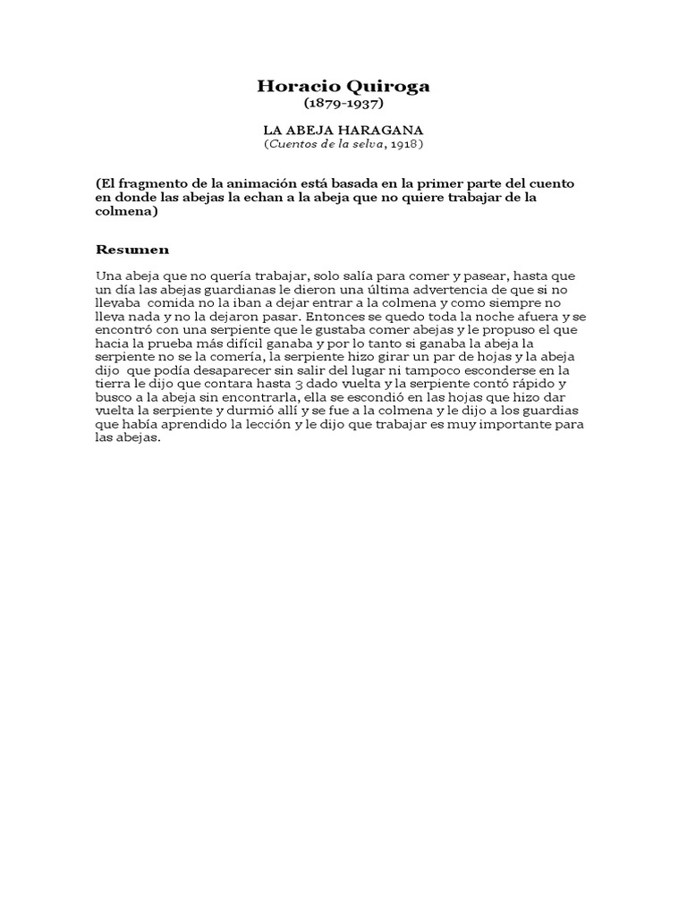 Cierto da al caer el sol el tiempo se descompuso 7. Horacio Quiroga 1879-1937 LA ABEJA HARAGANA Cuentos de la selva 1918 El fragmento de la animacin est basada en la primer parte del cuento en donde las abejas la echan a la abeja que no quiere trabajar de la colmena Resumen Una abeja que no quera trabajar solo sala para comer y pasear hasta que un da las abejas guardianas le dieron una ltima advertencia de que si no llevaba.