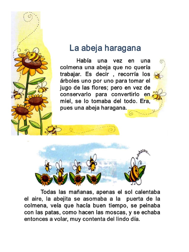 Esta abeja haragana se preocupaba ms por estar de flor en flor en lugar de cumplir con sus responsabilidades como las dems abejas. Es un cuento que tiene lugar en una cueva de un rbol y una colmena de abejas que esta localizado en la. Todas las maanas apenas el sol calentaba el aire la abejita se asomaba a la puerta de.