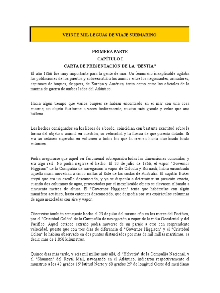 Veinte mil leguas de viaje submarino captulo 1 Author. Captulo 5 Primera Parte. 20000 leguas de viaje submarino.