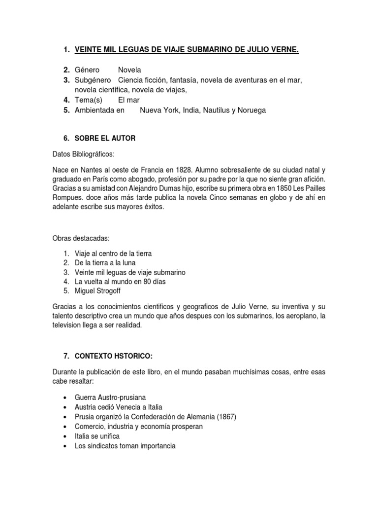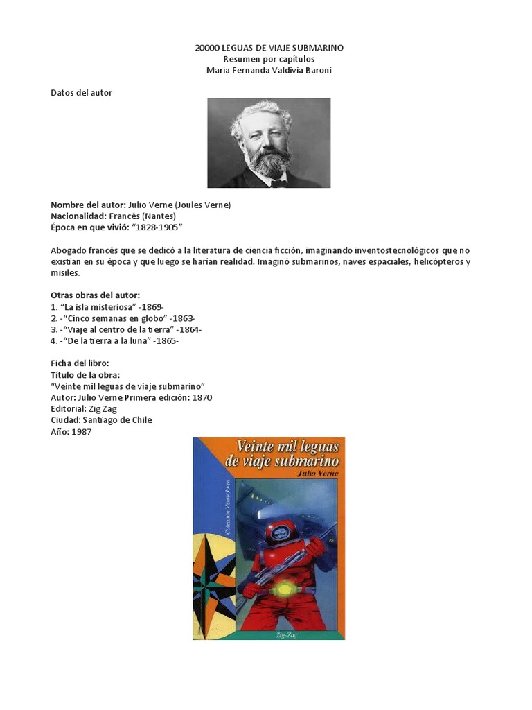 20 Mil Leguas De Viaje Submarino Resumen Por Capitulos ensayos y trabajos de investigacin 20 Mil Leguas De Viaje Submarino 20 mil leguas de viaje submarino Resea del libro El ttulo de la obra es Veinte mil leguas de viaje submarino. El ltimo que hemos conocido va a llegar de la mano de Disney que una vez ms ha recurrido al mundo de las letras para una de sus prximas producciones europeas. Todos comenzaron a correr al or el grito de Ned Land.